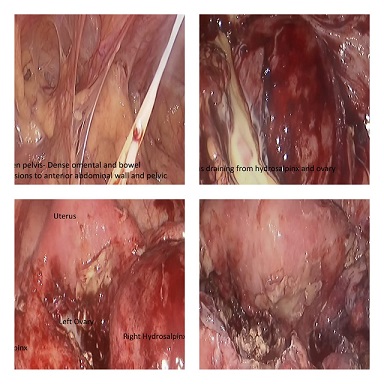 MINIMAL ACCESS SURGERY IN A FROZEN PELVIS. 28 year old female presented with complaints of lower abdominal pain, fever on and off, weight loss and infertility. Due to worsening pain, CT scan was performed which revealed bilateral hydrosalpinx and ovarian cyst, suggestive of ? TB or? Chronic PID. Laparoscopy was planned with consent for bilateral salpingectomy and ovarian cystectomy. Laparoscopy revealed a frozen pelvis with dense omental and bowel adhesions to anterior abdominal wall, uterus, both hydrosalpinx and ovaries. Systematic adhesiolysis was done to visualise pelvic structures. Dense bowel adhesions were removed with difficulty with sharp and blunt dissection.Large amount of frank pus was drained from both Hydrosalpinx and left ovary. Bilateral salpingectomy and ovarian pus drainage was done with copious peritoneal lavage.